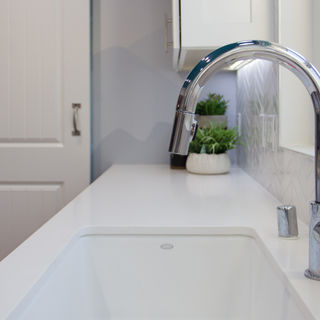 Featured on Season 16 of HGTV's House Hunters Renovation, this dingy and outdated kitchen was completely overhauled. The wall separating the kitchen from the dining room was knocked down to feature an island with seating for four and a one-of-a-kind quartzite countertop. The cabinets were extended the entire length of the kitchen, providing maximum storage and countertop surface for this young family of four. The ceiling was painted a bright teal to add a fun splash of color in a way that could be easily changed as trends shift in the future.